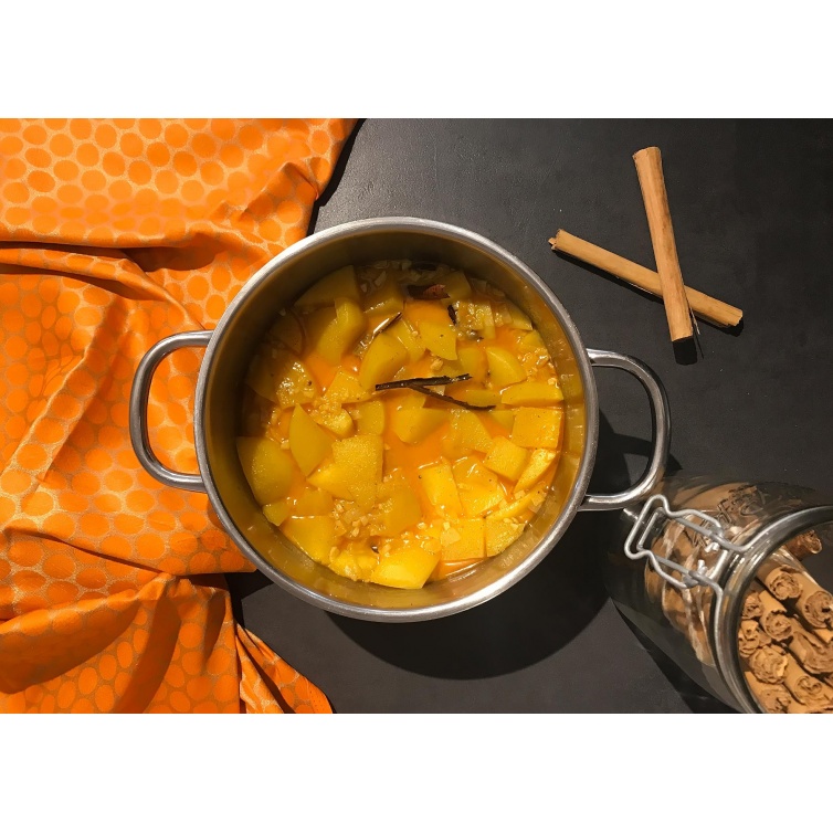 Ce curry de mangue nous rappelle les saveurs sucrées des mets de chasse. Il se marie parfaitement bien avec un curry de boeuf ou un dahl et du riz. Parfois, les mangues que l'on trouve chez nous ne sont pas très mûres mais c’est justement parfait pour cette recette!