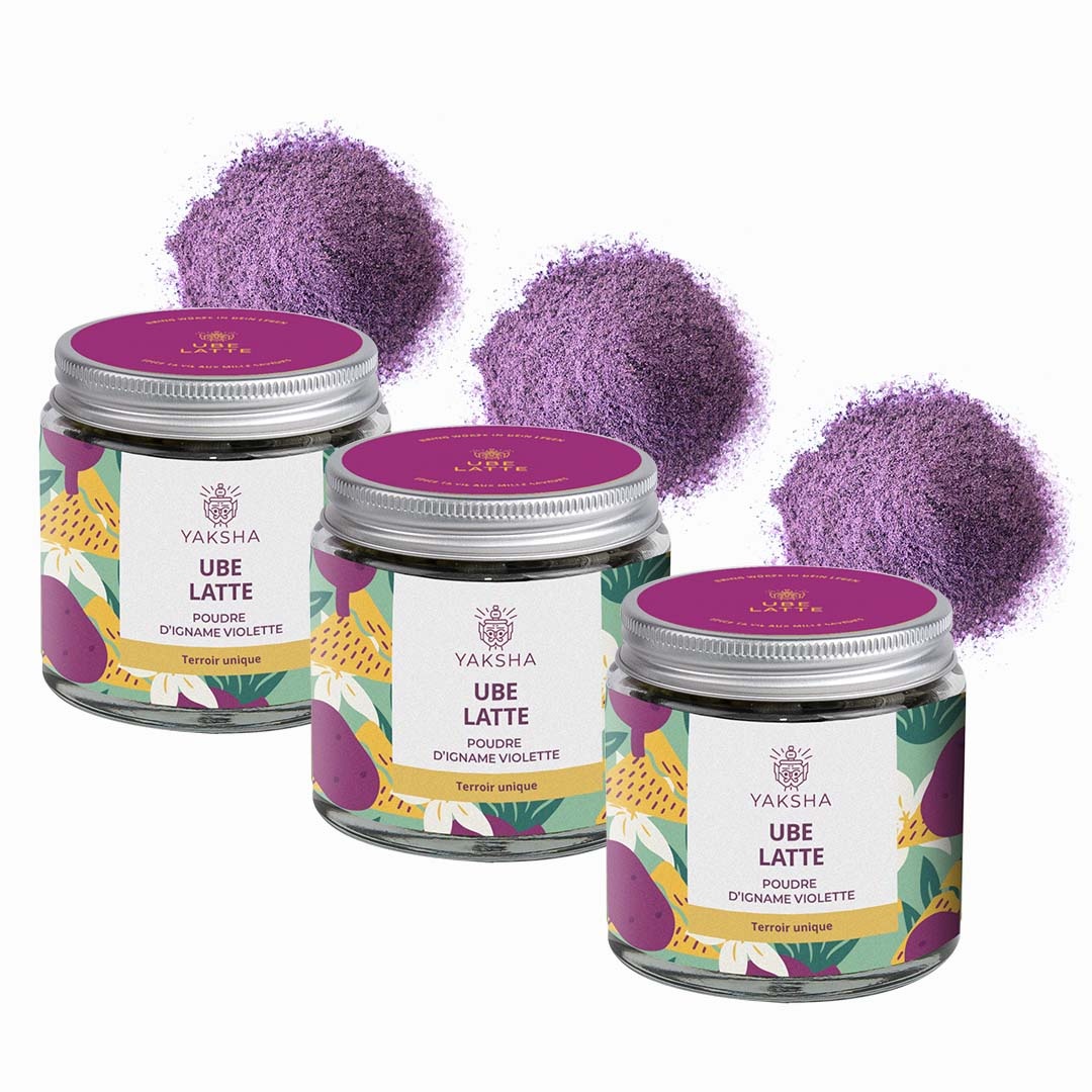 - 3 pots en verre : ube en poudre pure (90 g chacun)