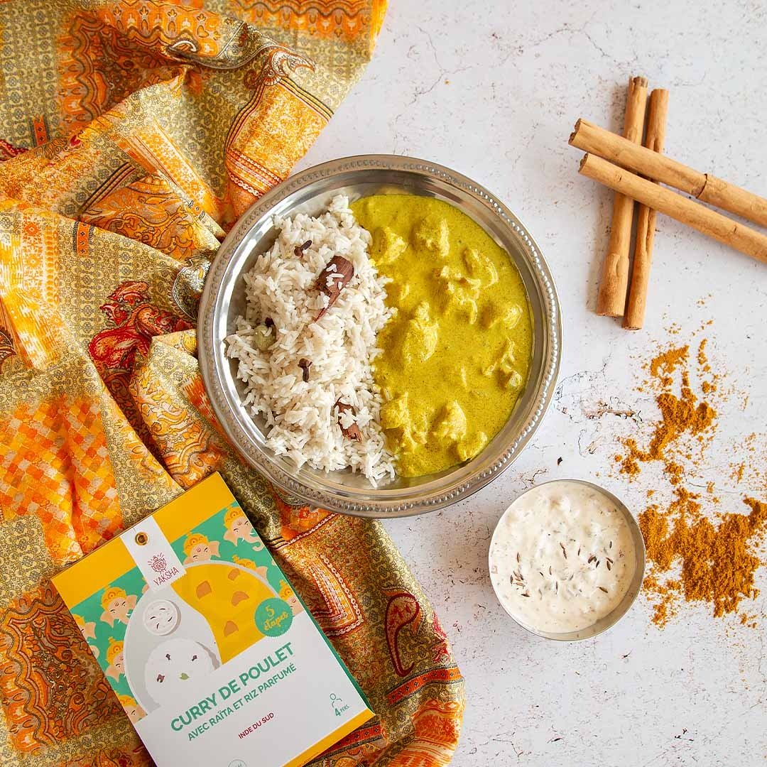 Le curry de poulet ou poulet au curry se réalise à base d’un mélange d’épices sophistiqué et subtilement dosé. En Inde, chaque cuisinière prépare quotidiennement son mélange traditionnel sur le moment alors qu’ici, on a l’habitude de cuisiner avec notre poudre de curry jaune déjà préparée. Le secret indien? La cuisine indienne ne se prépare pas seulement avec 2 cs de curry mais au minimum le double par plat. Avec 26 g d’épices, ce kit de recette permet de découvrir un authentique curry de poulet aux saveurs d’Inde du Sud. Accompagné d’un riz parfumé aux épices et d’une raïta, une sauce à base de yogourt et d’épices torréfiées, ce kit te promet un départ immédiat pour l’Inde du Sud. Alors que dirais-tu de sortir ton tablier et de régaler tes convives de saveurs épicées en organisant une soirée Bollywood en un claquement de doigts? Ambiance namasté garantie!