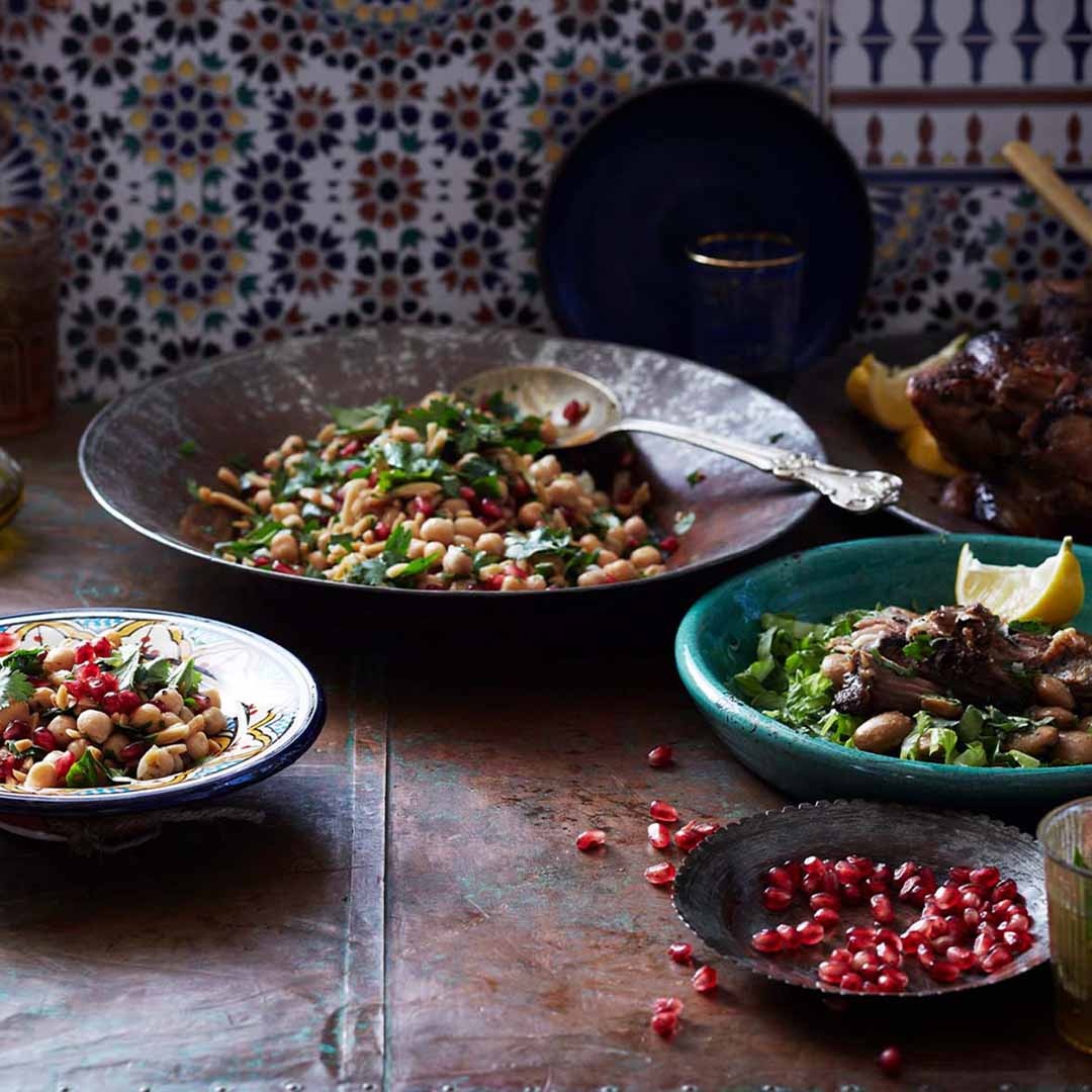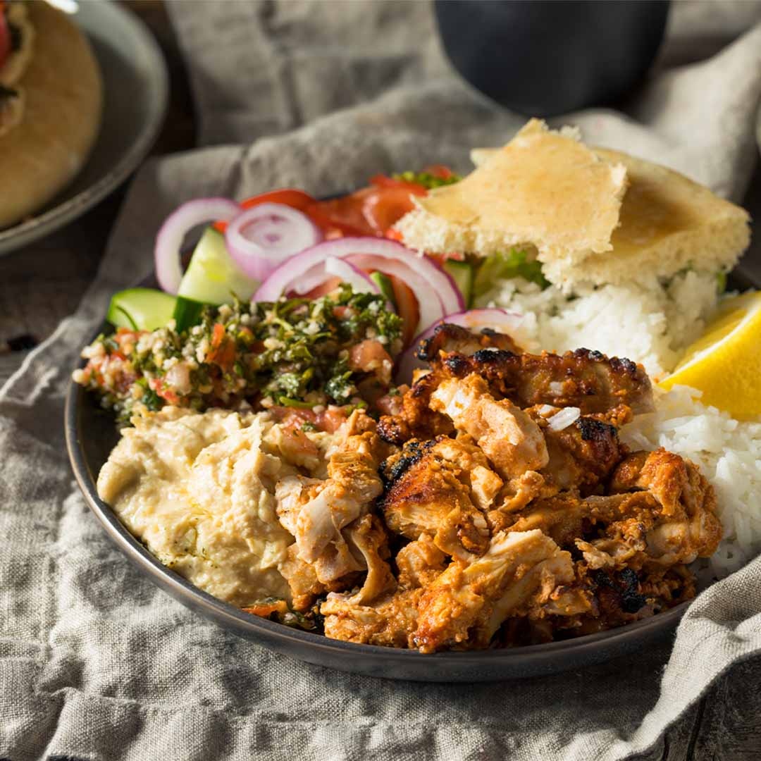 • Légumes rôtis au four, aubergines fondantes, pois chiches croustillants, houmous maison, agneau grillé, poulet mariné, keftas, riz pilaf, sauces au yaourt, courges rôties au tahini
