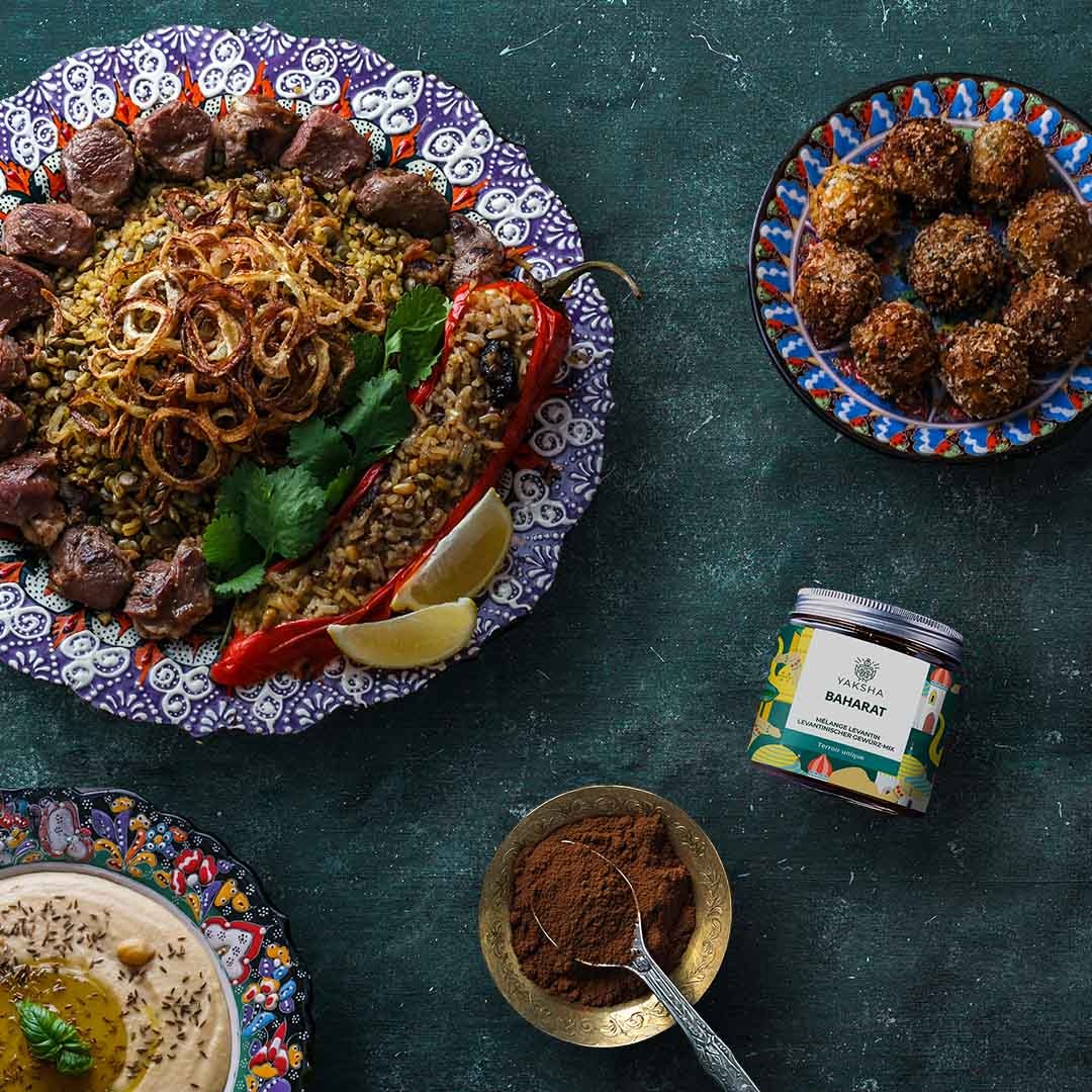 Le baharat est pensé pour les cuissons lentes et les plats mijotés, mais pas uniquement. Il accompagne toutes les préparations qui demandent chaleur, profondeur et une signature aromatique immédiate. Saupoudre-le sur des légumes rôtis au four : carottes, courges, aubergines ou chou-fleur légèrement caramélisés. Mélange-le à un riz pilaf aux amandes et raisins, ou incorpore-le à des pois chiches croustillants tout juste sortis du four. Réveille une épaule d’agneau mijotée, un poulet rôti aux oignons ou des keftas grillées. Il sublime aussi un simple houmous maison, une sauce au yaourt ou des légumes sautés. En finition sur des œufs, des lentilles mijotées ou même des pommes de terre rôties, il apporte immédiatement profondeur et caractère.